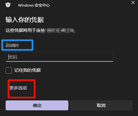如果最后出现只有输入密码的界面,而没有输入用户名的界面,首先检查蓝色方框处用户名是否正确,如果正确,直接输入密码,如果不正确,点击更多选项,后续步骤一致